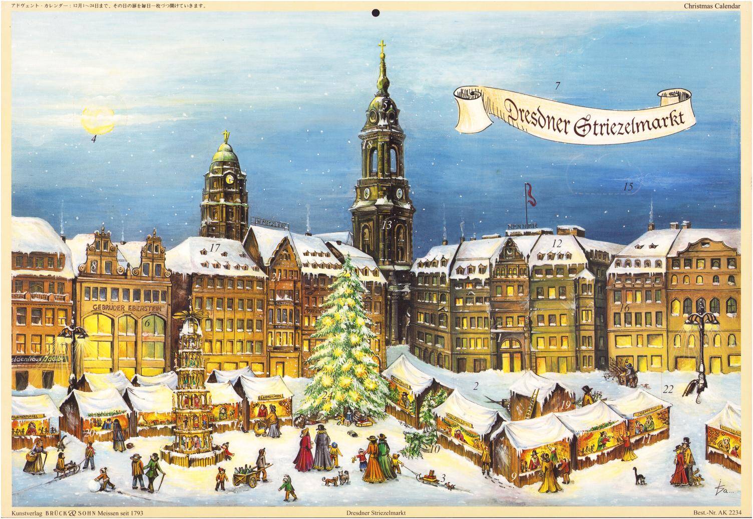Einer der ältesten und auf jeden Fall einer der bekanntesten Weihnachtsmärkte Deutschlands ist der jedes Jahr auf dem Dresdner Altmarkt stattfindende Stiezelmarkt. Unser Adventskalender zeigt eine historische Ansicht mit einem Weihnachtsmarkt vor der Dresdner Kreuzkirche, Heimstatt des berühmten Kreuzchores, und dem Rathaus Dresden. Der Striezelmarkt ist heute der Mittelpunkt einer einer Weihnachtsmarktachse, die sich quer durch die Innenstadt Dresdens zieht und Ihnen mehrere Kilometer ununterbrochenen Weihnachtsmarktflair bietet. Genießen Sie die Weihnachtszeit und die romantische Stimmung auf Dresdens Straßen und Plätzen.