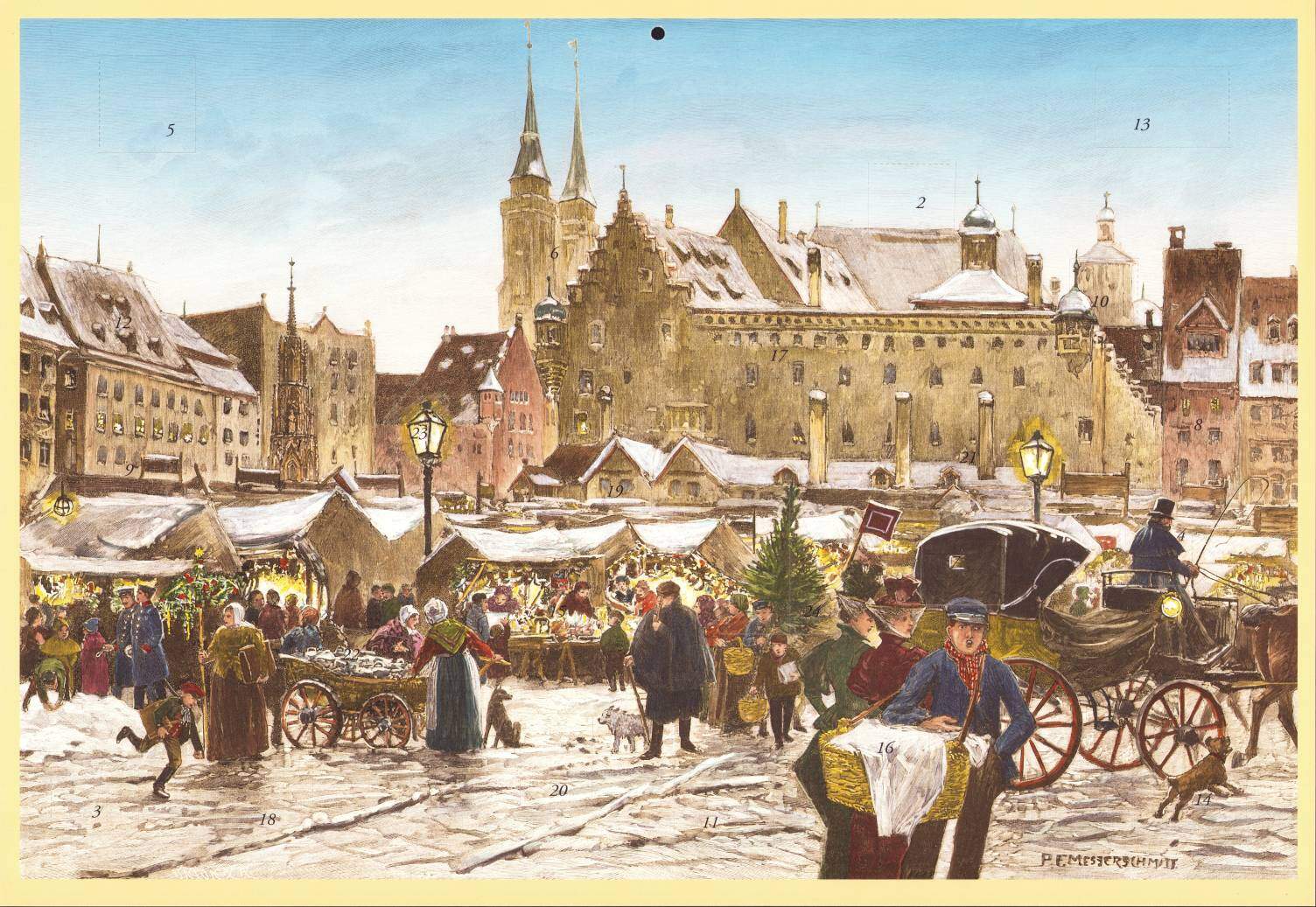 Adventskalender Nürnberg mit dem berühmten Christkindlesmarkt in einer historischen Ansicht des Malers Pius Ferdinand Messerschmitt.